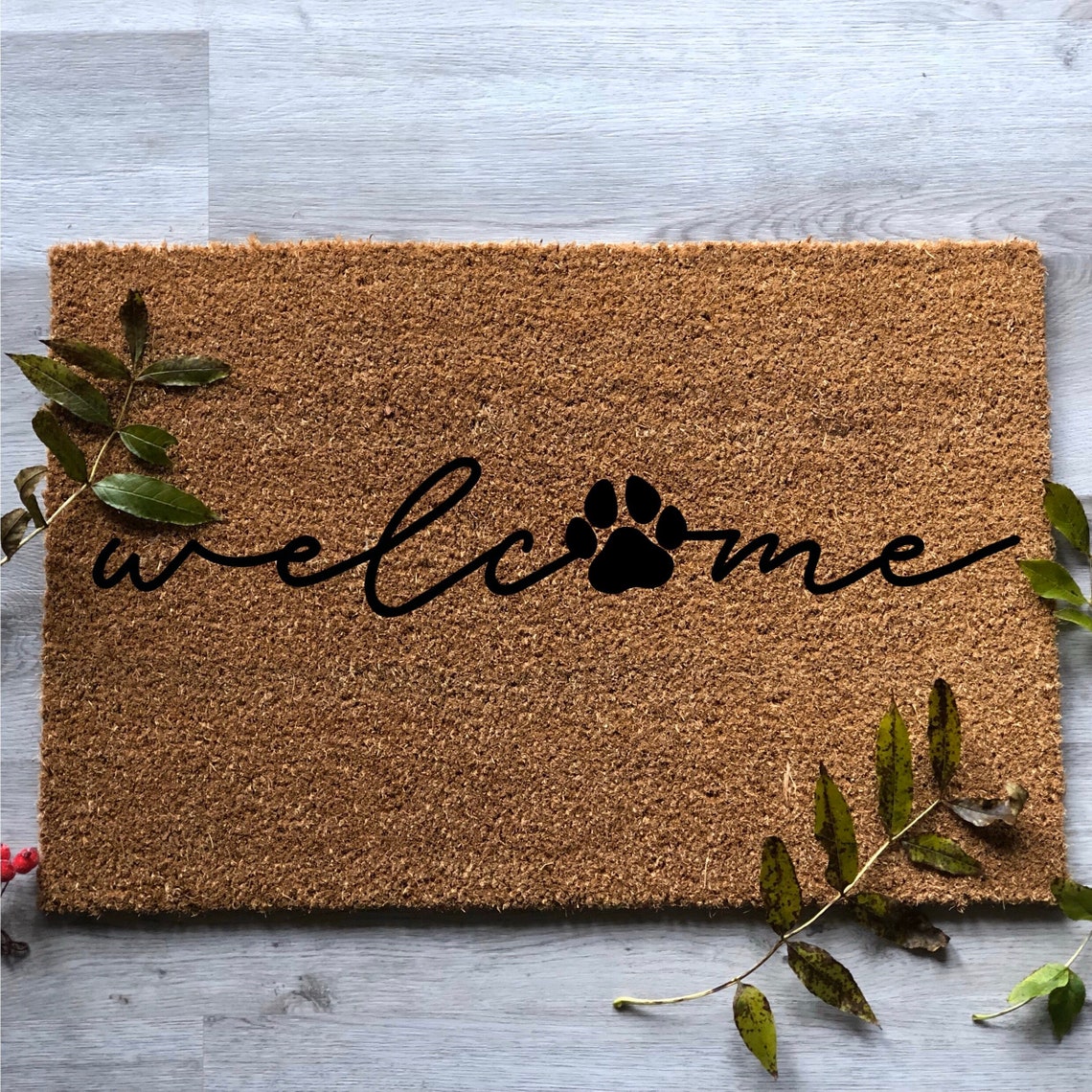 This welcome mat features a sweet paw within the design. A subtle but delicate design perfect addition to any welcoming doorway.