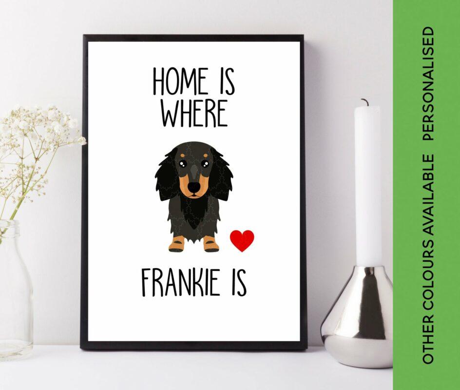 This print makes a great sausage dog gift. You can choose from long hair, short hair or wire-haired in a variety of red, cream, black & tan, chocolate & tan, blue & tan or golden colours. Also available in Piebald and a range of Dapple colours! Have two dogs? Twice as nice, check out this alternative print.