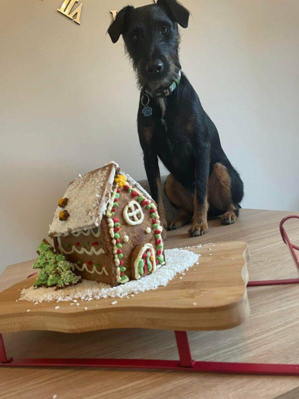 Buddy went all out with this combination of a house, gingerbread people, turkey bone and even coconut flour snow!